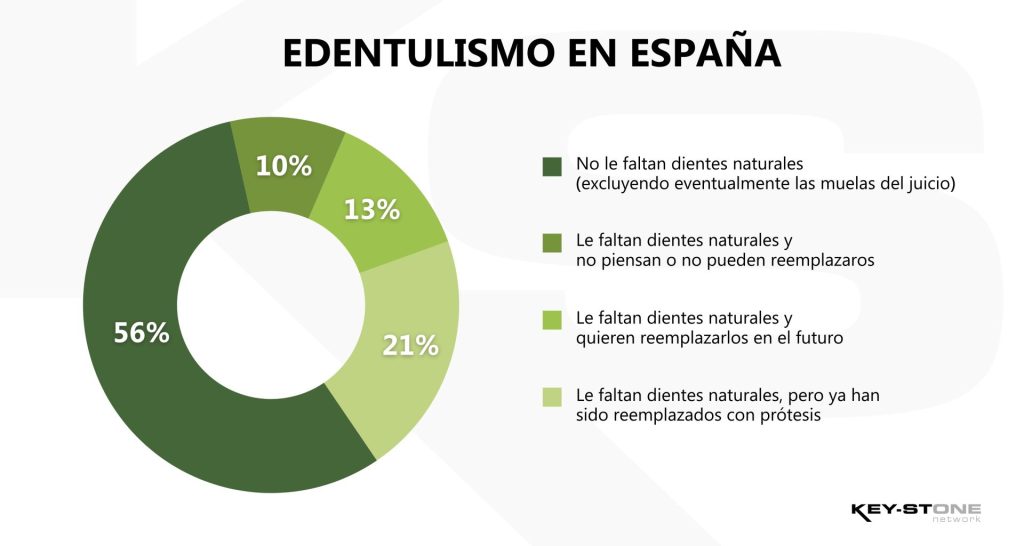 Es decir, actualmente al 23 % de la población adulta le faltan dientes en España. Esto corresponde a casi 10 millones de españoles. De ellos, la mitad declara estar dispuesta a resolver el problema sustituyendo los dientes que le faltan, mientras que la otra mitad dice no estar interesada o, con mayor frecuencia, no tener disponibilidad económica para resolver el problema con una solución protésica.